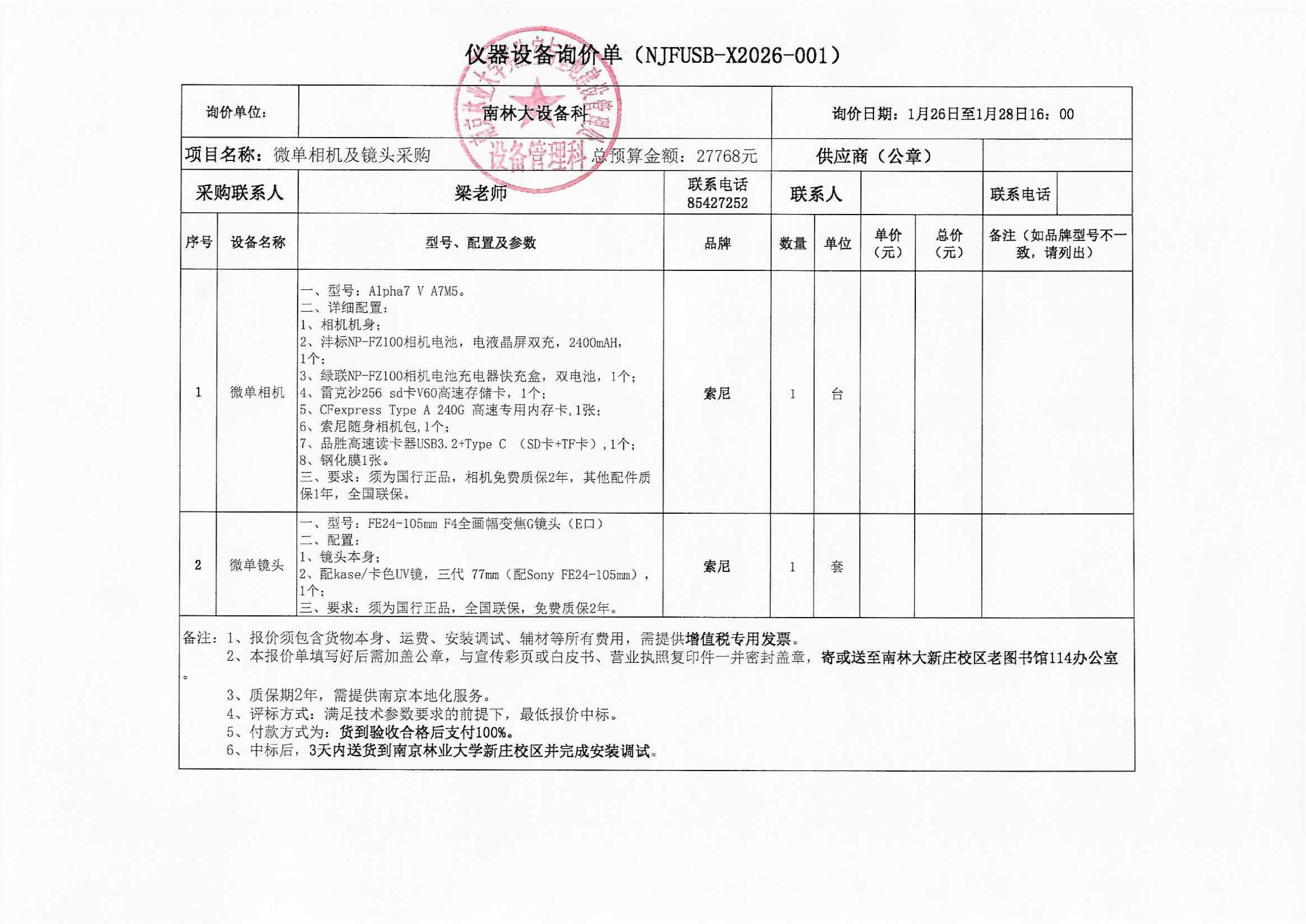 微单相机及镜头采购(NJFUSB-X2026-001)