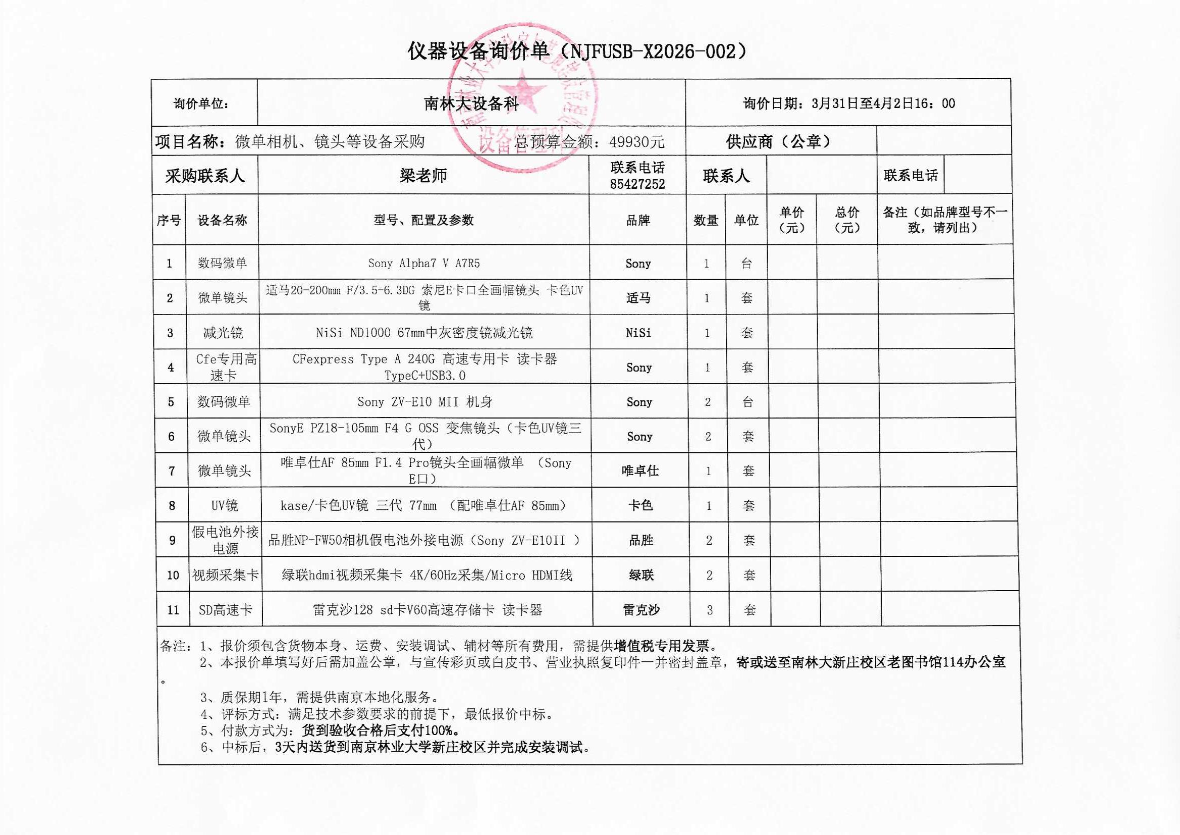 微单相机、镜头等采购(NJFUSB-X2026-002)